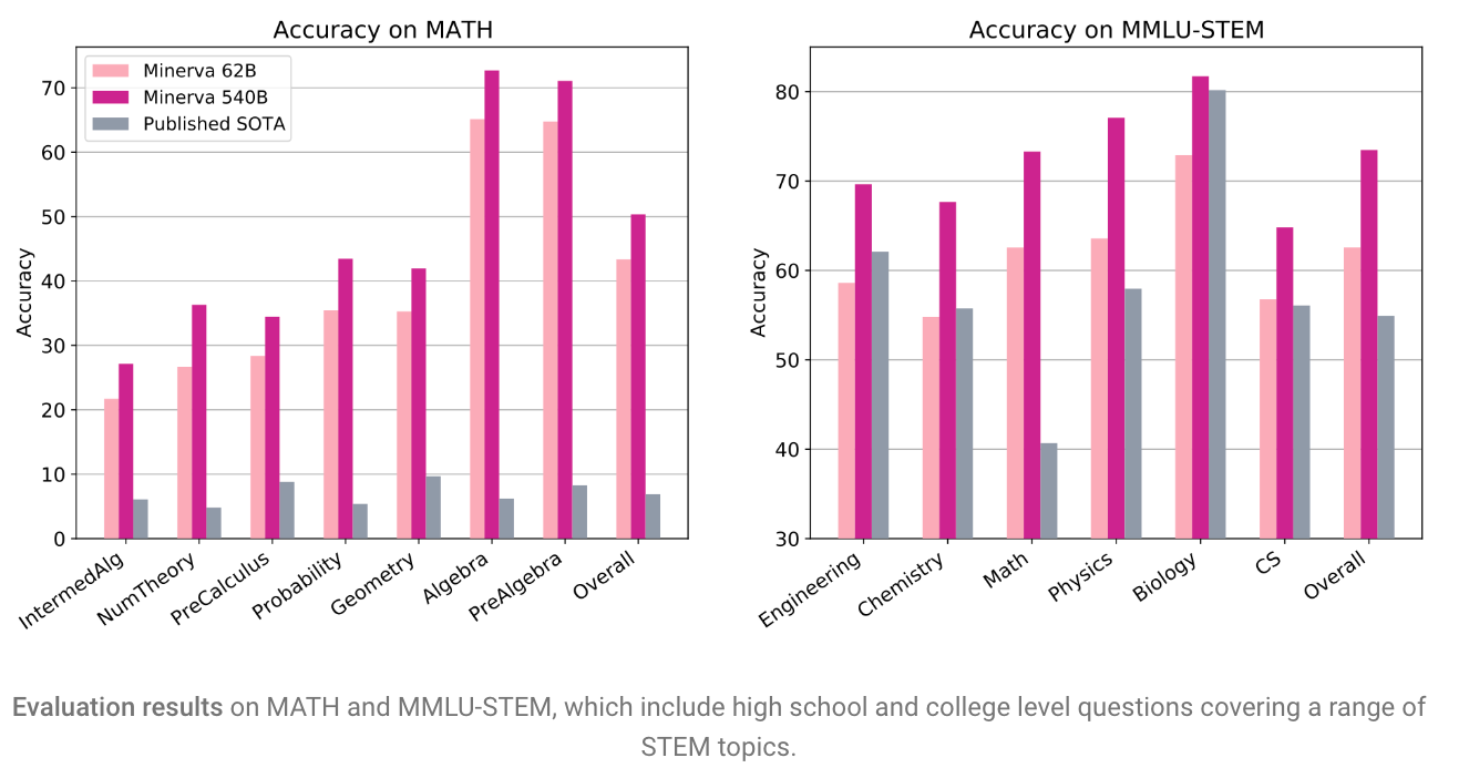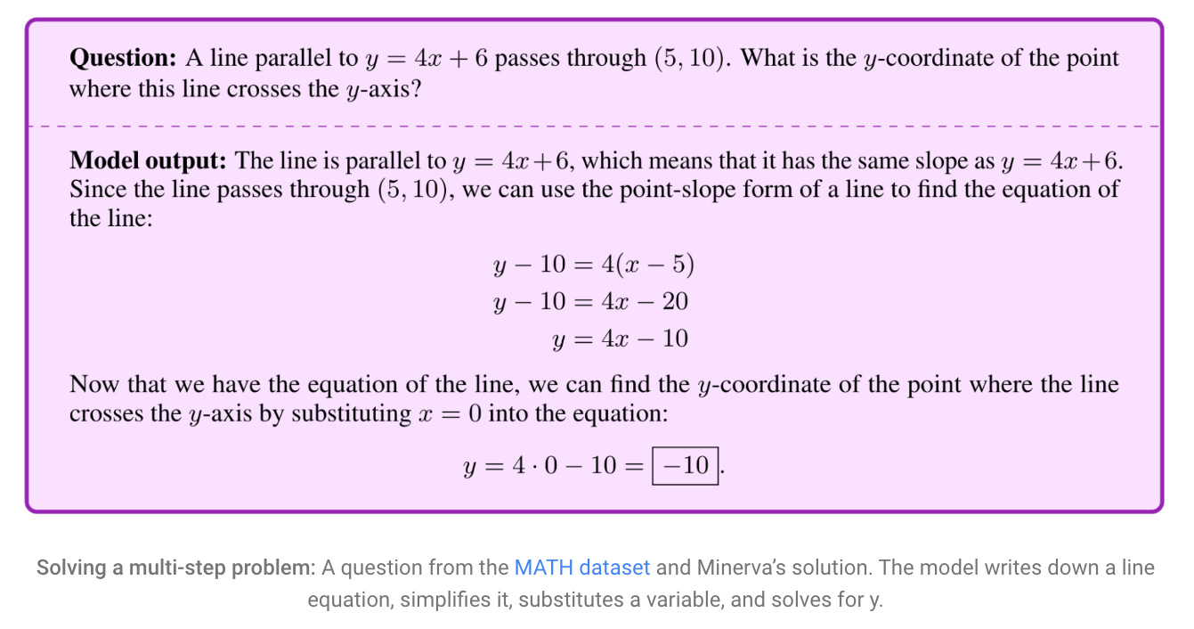 https://ai.googleblog.com/2022/06/minerva-solving-quantitative-reasoning.html: Google’s new Minerva system achieves astounding performance on the challenging MATH benchmark suite. The reasoning performed is quite sophisticated as the image below shows. Minerva is built on Google’s PaLM 540B parameter model and provides compelling additional evidence for the scale hypothesis. Minerva achieves dramatic improvement over the previous state of the art. Most observers of the field would not have expected dramatic progress on mathematical reasoning tasks in such a short time frame